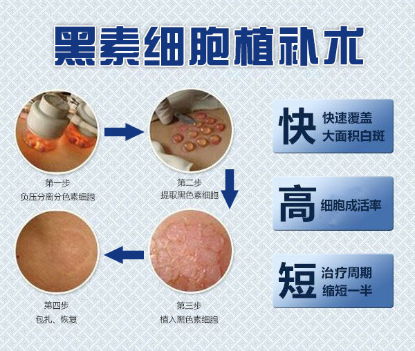 先采用中药渗透疗法,打开皮肤毛孔,刺激移植表皮黑色细胞的增生;再采用黑素细胞植补术从患者自身细胞中分离出活性黑色素细胞,种植于白癜风病灶,促进黑色素细胞成活、分裂,快速促使白斑区域恢复正常肤色。