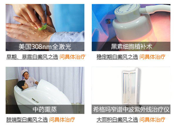 先利用中药药浴,打开白斑处皮肤毛孔,促进药物吸收,激活体内失活的黑色素细胞;再利用美国308激光,直接作用于白斑患处,刺激黑色素细胞生长,快速祛除皮肤白斑。