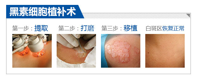 通过手术获得患者健康部位的黑色素细胞,在体外进行培养繁殖,增加黑色素的数量,再将足量优质的黑色素细胞植入患者的白斑部位,注射生长液,刺激黑色素自行恢复,再生黑色素,达到治疗白癜风的目的。