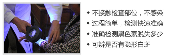 只有依靠专业的检测设备,才能准确筛查出白癜风的诱发病因是什么。南通复大斥资引进了德国Wood灯,该设备可根据病变部位对wood光的荧光颜色反应黑素的缺失多少,从而与其他白斑相区分,能判断肉眼看不见的皮肤病变。